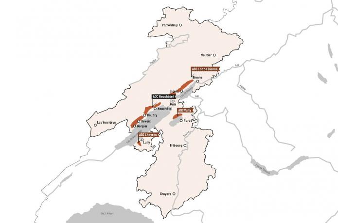 The Three-Lakes region extends from the southwest to northeast Jura range and encapsulates Lake Neuchâtel, Lake Biel and Lake Murten. Most of the vineyards can be found along a 20 mile stretch along the southeast facing slopes of the lake.